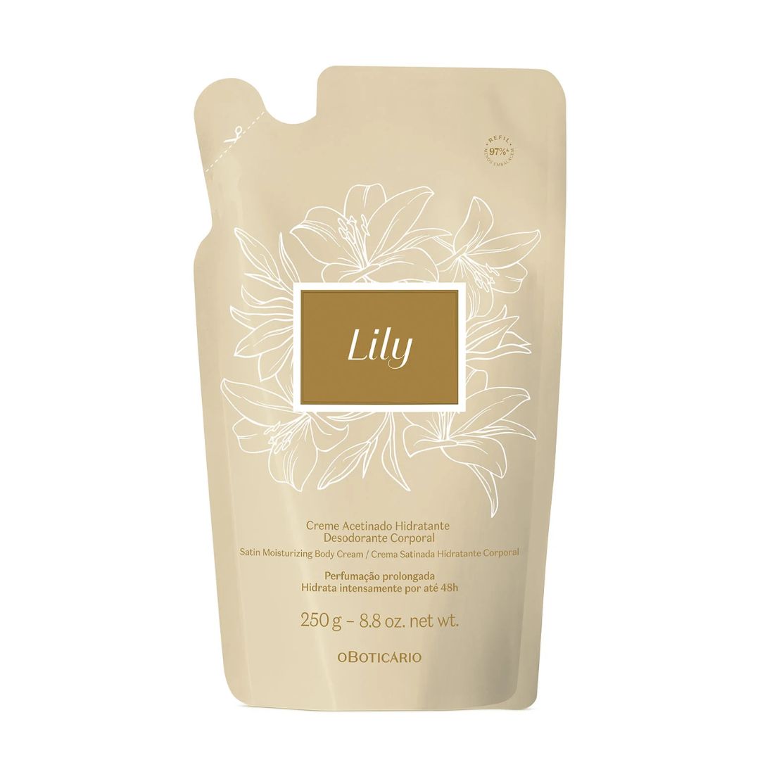 O Refil Creme Acetinado Hidratante Desodorante Corporal Lily entrega perfumação prolongada e fragrância intensa para sua pele na medida certa.